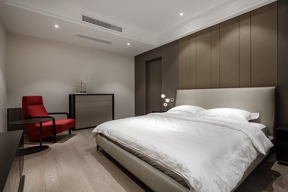 In the fast-paced life, home is a place to recharge oneself. With simple furnishings and plain colors, the bedroom is full of comfort and security. The decorations and a touch of vivid red in the space add a lot of fun, and relieve one from all the fatigue. With a good sleep, there will be a fresh start in the next morning...