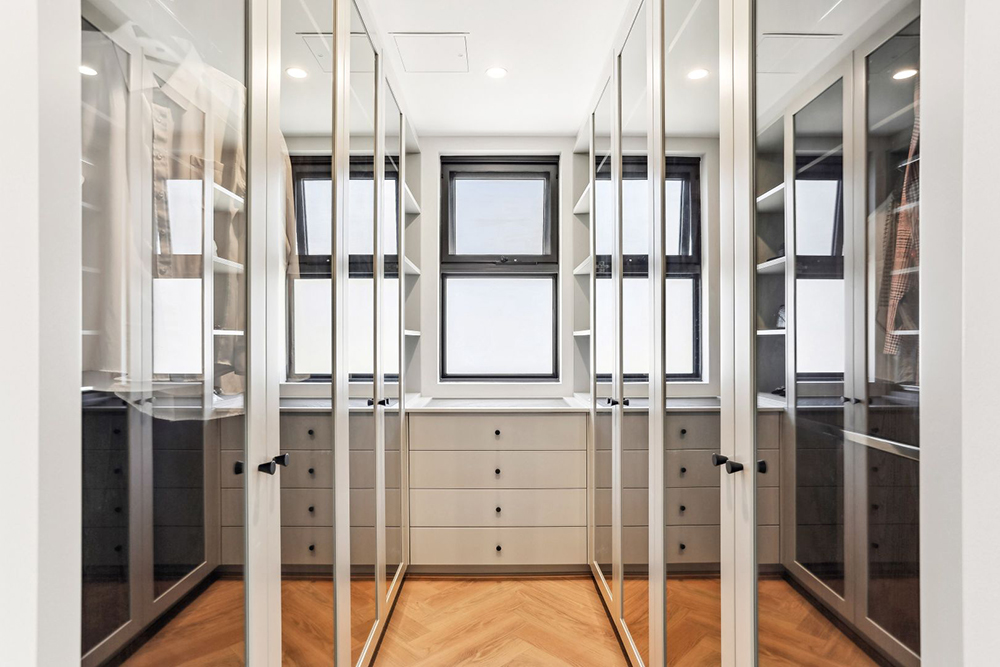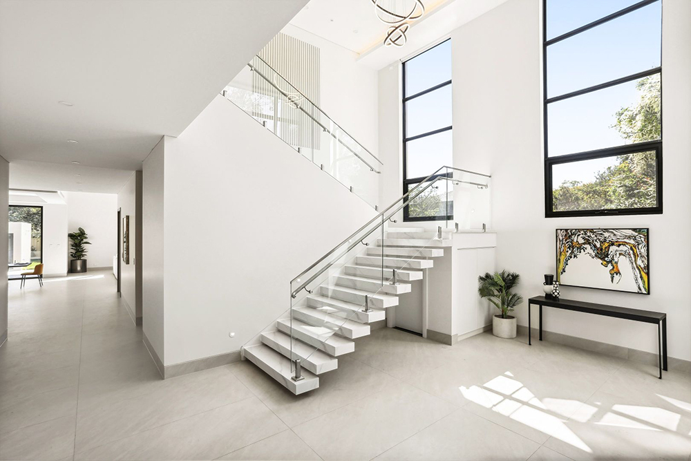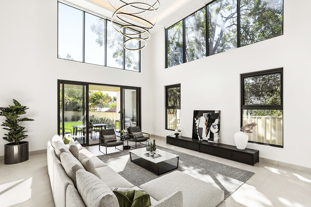 穿过草坪和双车库步入建筑内,一片豁然开朗,别有洞天。客厅双层挑高,三面墙体上采用大尺寸方窗设计,让室内室外连通,既保证了充足的采光,又可以270°欣赏窗外四季变化的景色,让居者仿佛置身于自然之中,与四季同呼吸。