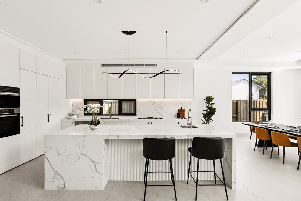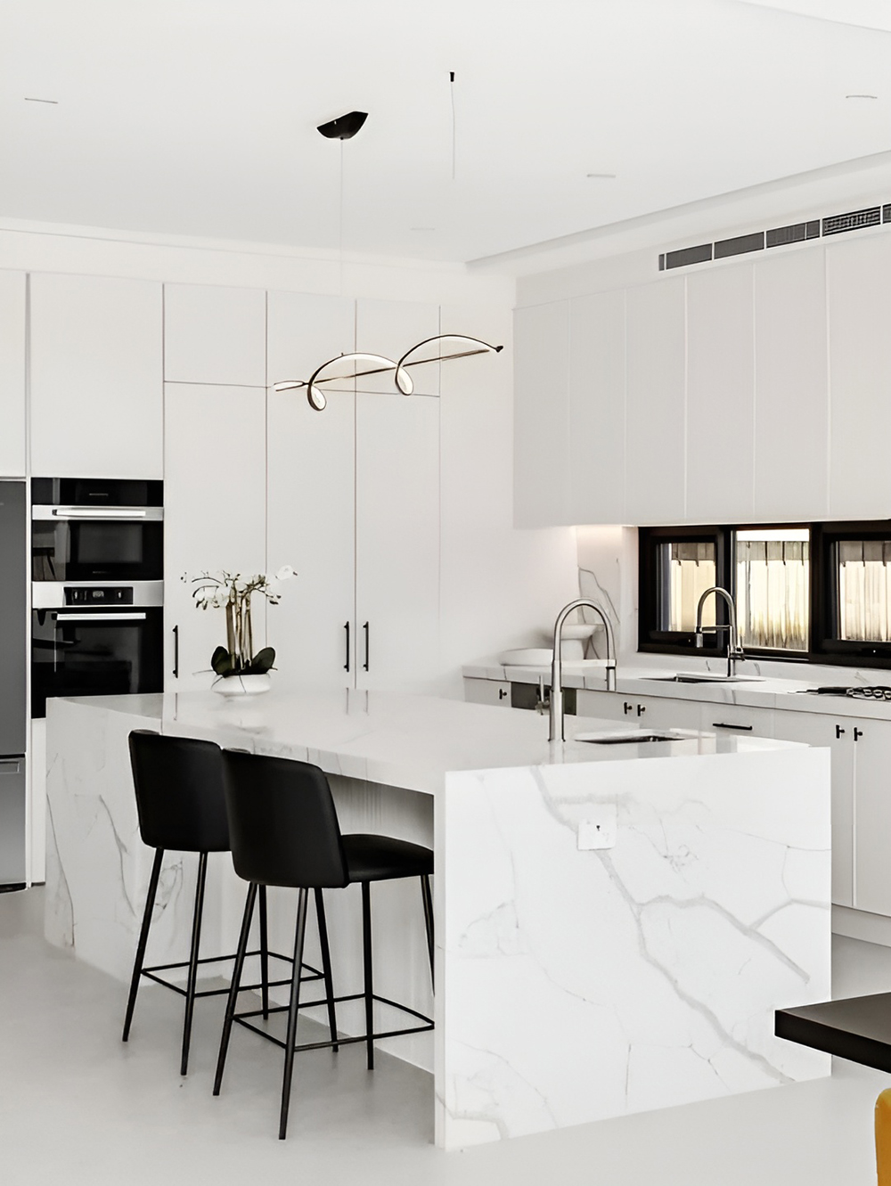 餐厅另一侧是开放厨房和岛台,白色木饰面和理石面让厨房看起来一尘不染,两把黑色BALLET吧椅盈盈而立,为这一区域增添一抹现代魅力。